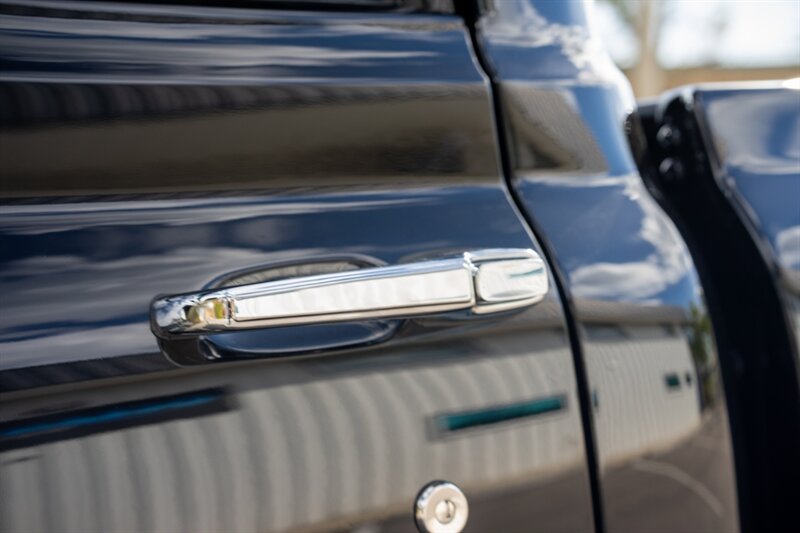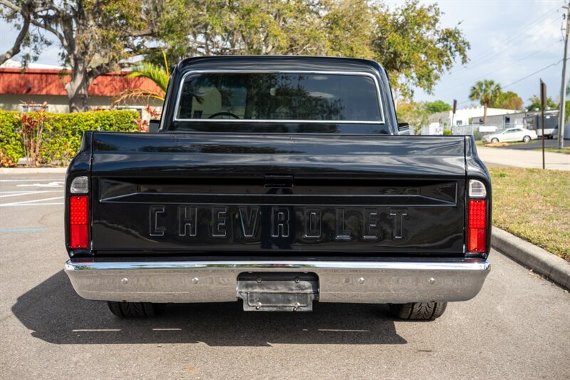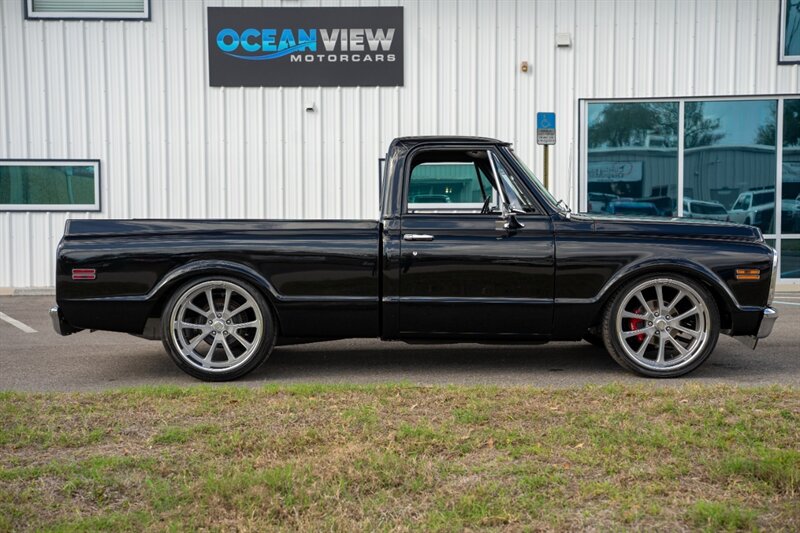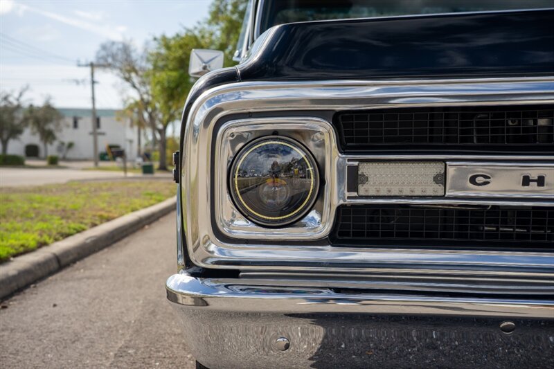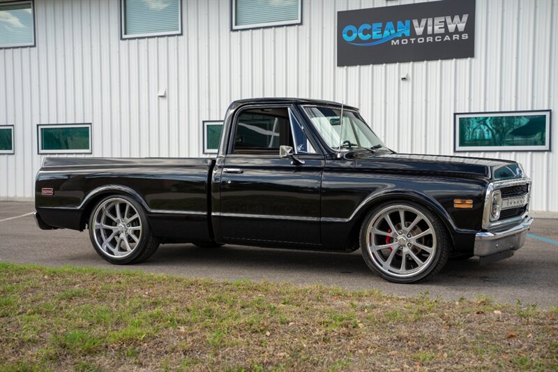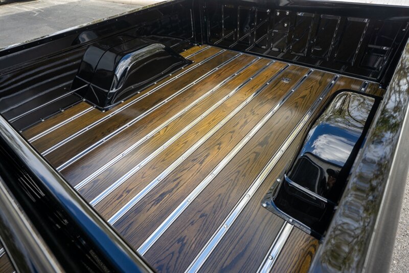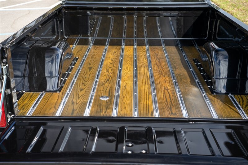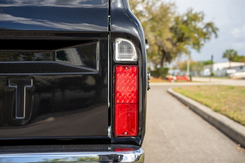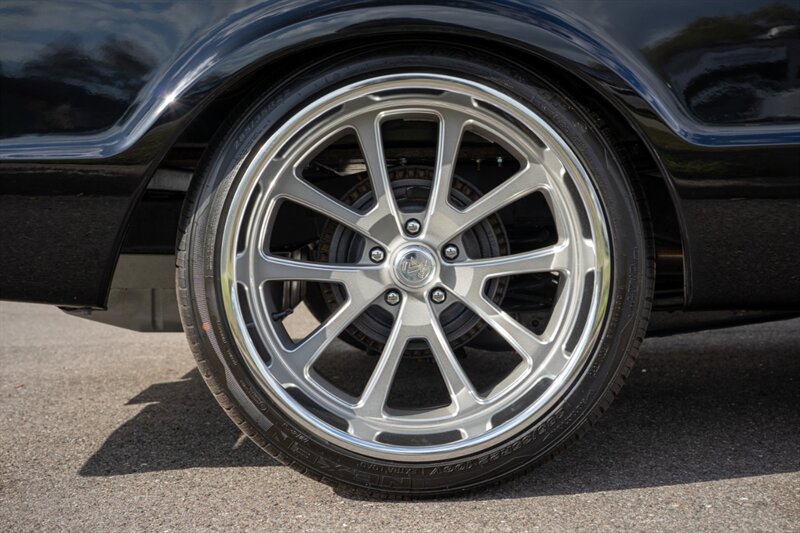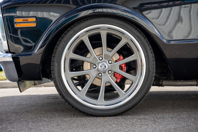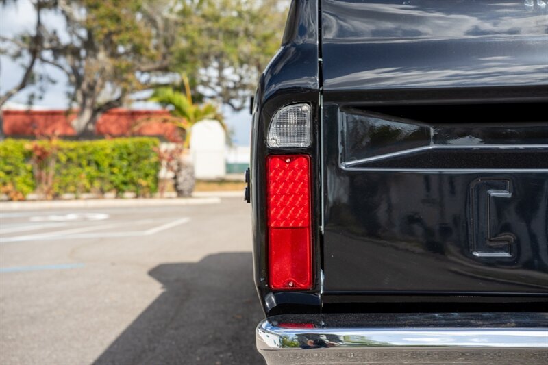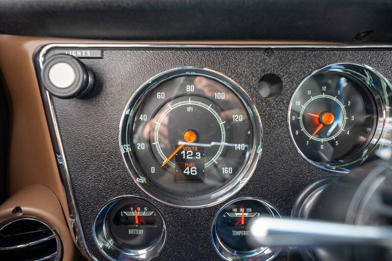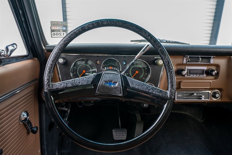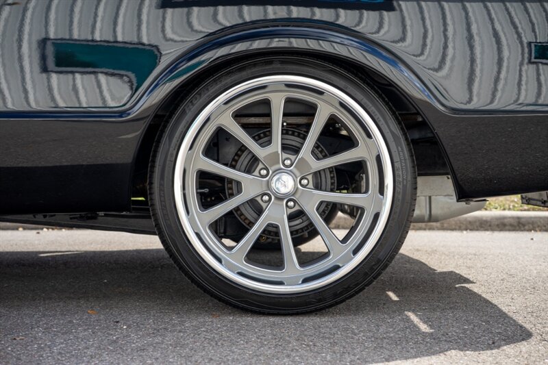 The exterior is finished in an attractive black that emphasizes the truck’s clean, iconic 1970 sheetmetal. The short bed configuration keeps the truck’s proportions compact and balanced—this bed length was the popular choice for urban and weekend use, while still offering useful cargo capacity. Styling cues from 1970 include the twin round LED headlights flanking the wide chrome-trimmed grille, prominent front and rear bumpers, and the straightforward, muscular fender lines that define the era. Chrome trim and brightwork are restrained and appropriate to the model, while the tailgate presents the classic stamped Chevrolet script. Side emblems identify the model and trim level consistent with period details. The truck rides on 22 inch Laguna R101s and all exterior panels present well with tight gaps and good fitment consistent with its frame off restoration