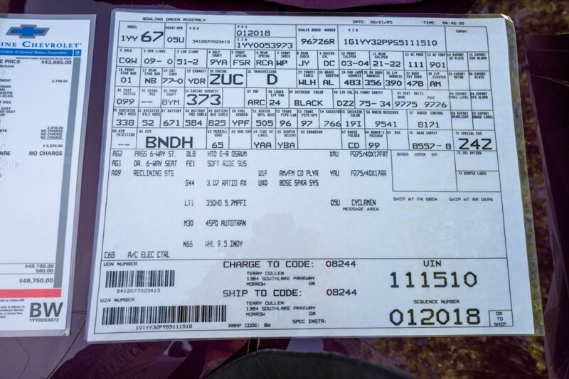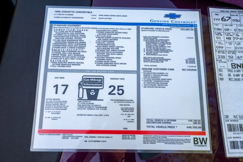 Introducing the 1995 Chevrolet Corvette PACE CAR, a vehicle that is sure to turn heads with its stunning Cyclamen Metallic exterior and sleek design. This vehicle is powered by a 5L NA V8 overhead valves (OHV) 16V engine, which provides a powerful yet smooth driving experience.
