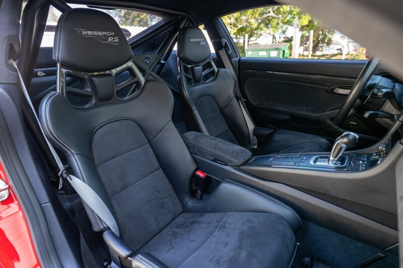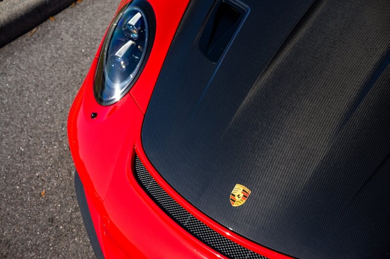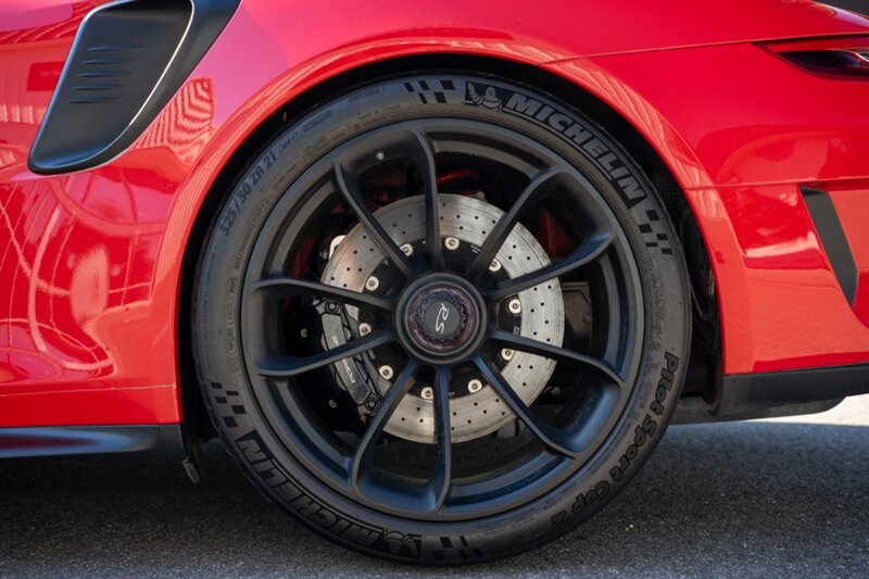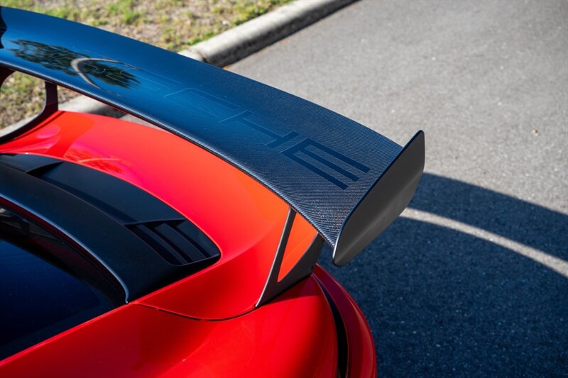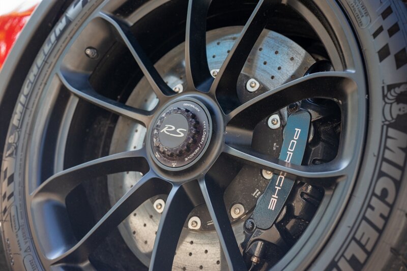 As a factory RS model, the aerodynamic package is purpose-built. The exterior in Guards Red emphasizes the GT3 RS’s aggressive stance. Factory aerodynamic elements include a large fixed rear wing and a pronounced front splitter, both designed to increase downforce and stability at speed. Functional vents and ducts across the front fascia and on the front fenders aid airflow management and brake and engine cooling. The sculpted bodywork and lightweight exterior components are integrated to balance high-speed stability with track agility. The vehicle rides on center-lock wheels (factory-spec sizing for front and rear), fitted with high-performance tires engineered for maximum grip.