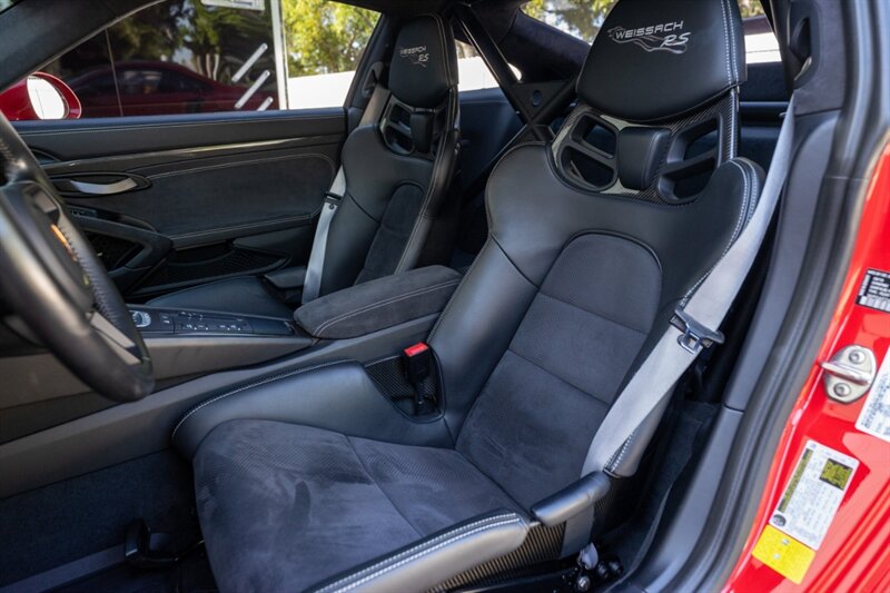 The interior is finished in Black and reflects the GT3 RS’s purposeful nature, blending race-inspired weight savings with driver interface quality. Sport seats designed to provide lateral support for high-G cornering are standard, with materials and bolstering choices oriented toward track use and driver support. The steering wheel typically features Alcantara or performance trim with a clear view of the instrument cluster and shift lights to aid track driving. Carbon fiber and lightweight trim elements are integrated into the cabin to reduce weight and emphasize function.
