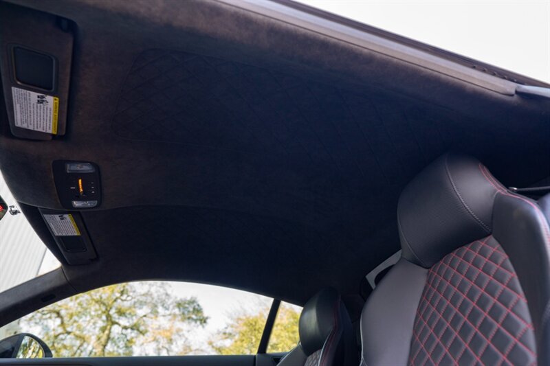The cabin is trimmed in Black with Express Red stitching, a pairing that balances a performance-oriented look with refined visual detail. The cockpit seats are engineered to hold occupants securely during spirited driving while remaining comfortable for longer trips. Materials and finishes focus on tactile quality—leather and Alcantara surfaces on seats and steering wheel, contrasting red stitching, and driver-focused controls laid out to minimize distraction. The steering wheel is flat-bottomed and fitted with paddle shifters for manual control of the dual-clutch transmission. Seating is power adjustable and typically includes manual or electric lumbar adjustments, with options for heated function depending on factory specification.