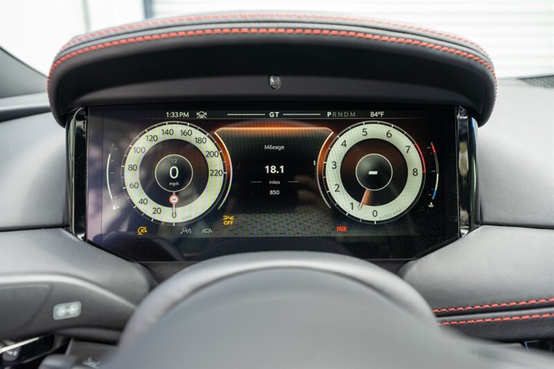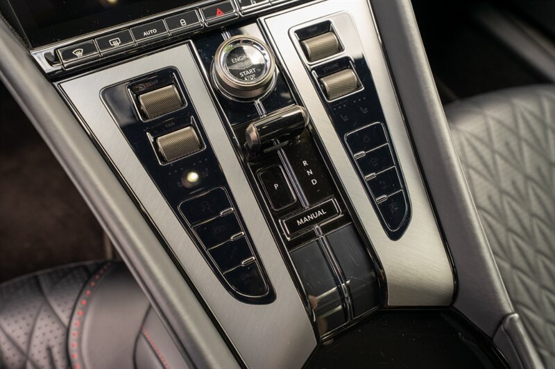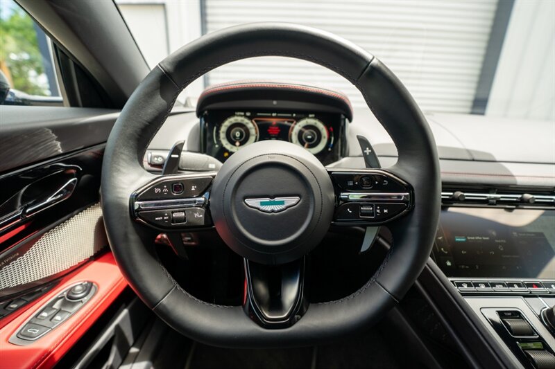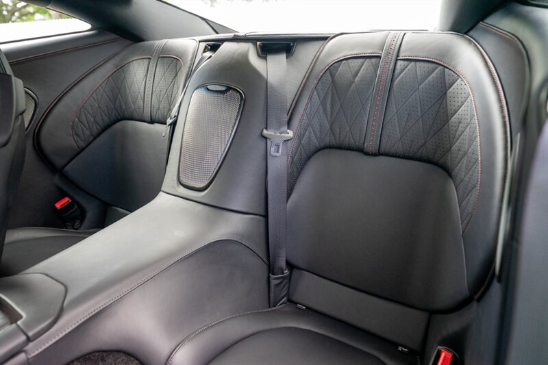The Onyx Black interior is finished in full premium leather with carefully executed stitching and a focus on tactile quality. Seating is supportive and designed for long-distance comfort, with multiple power adjustments, heating, and memory functions for the driver’s position. The DB12’s 2+2 seating layout provides a pair of comfortable front seats and smaller rear seats suitable for occasional use or for additional cargo when the rear seats are folded. Trim materials throughout the cabin are selected for a premium feel—soft surfaces on the dash and door tops, metal or dark-finish trim accents on the center console and switchgear, and durable carpeting underfoot.