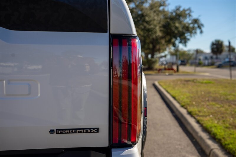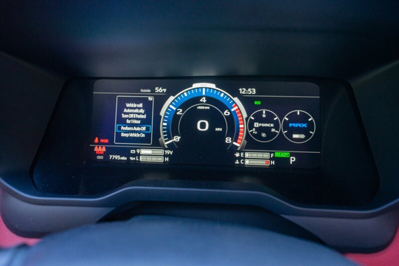 This 2025 Toyota Tundra TRD Pro HV pairs the TRD Pro’s off-road-focused hardware with Toyota’s i-FORCE MAX hybrid twin-turbo V6 powertrain. The 3.4L Hybrid Twin Turbo V6 produces a manufacturer-rated 437 horsepower and 583 lb-ft of torque, delivering strong low-end thrust and broad power for both on-road performance and off-road capability. The vehicle is finished in Ice Cap (a clean, classic white) and features a striking Cockpit Red interior treatment. It has accumulated under 8,000 miles total—averaging less than 4,000 miles per year—and is in excellent overall condition. EPA-estimated fuel economy for this configuration is approximately 18 MPG city and 20 MPG highway.