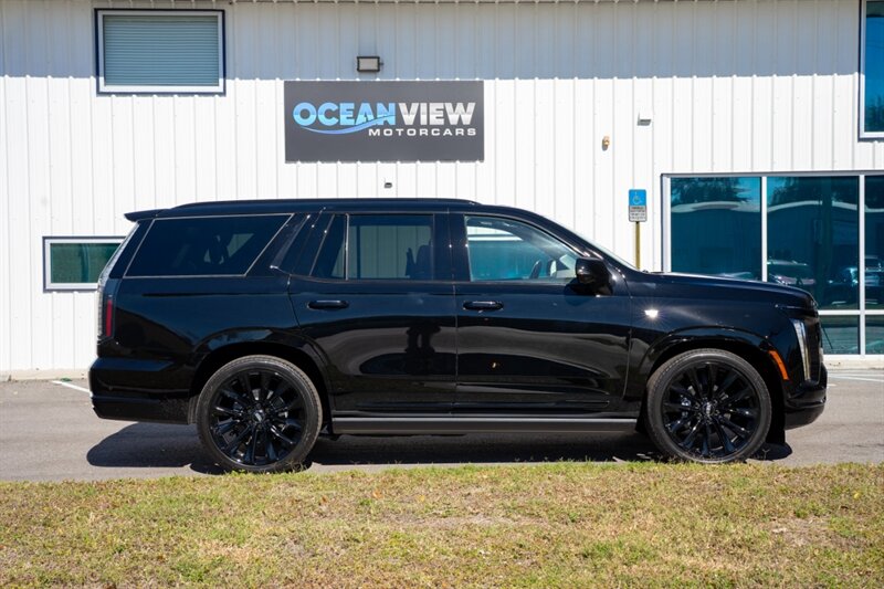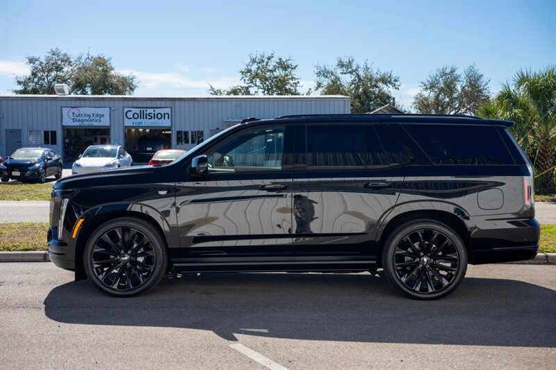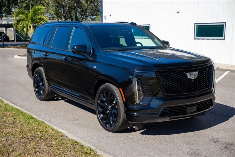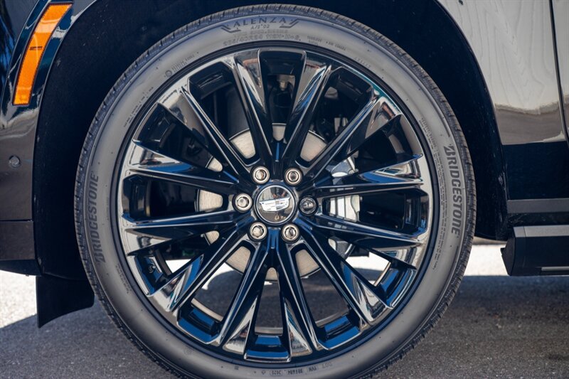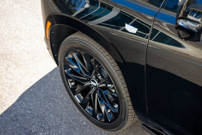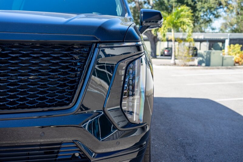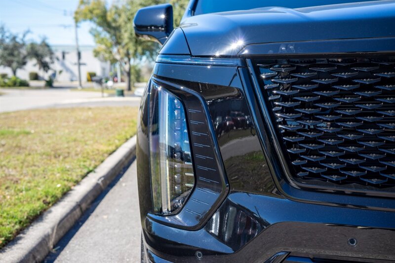 The Black Raven finish is a deep, glossy black that complements the Platinum Sport’s sculpted bodywork and stance. Exterior design cues for this sport-oriented Platinum trim include a more aggressive front fascia and distinctive trim accents that differentiate it from other Escalade versions. Factory LED headlamps and taillamps provide bright, efficient illumination and a modern signature lighting pattern. The vehicle is fitted with premium alloy wheels that are designed to match the Platinum Sport appearance — offering both style and road presence — and the tires are selected for a balance of grip and comfort. Exterior conveniences include power-operated features such as a hands-free liftgate and power-folding mirrors; integrated parking sensors and camera systems are factory-equipped to assist with maneuvering and parking.