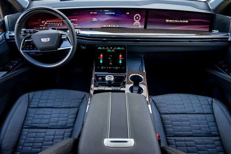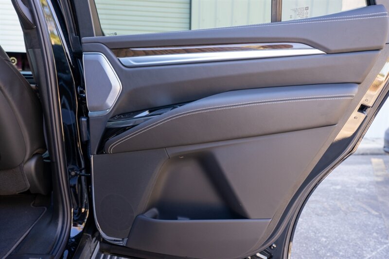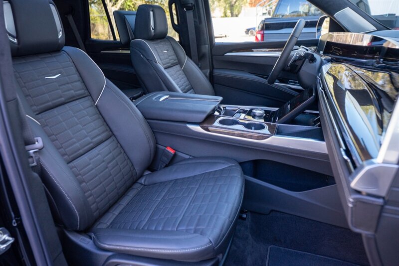 Inside, the Jet Black interior creates a refined and cohesive cabin atmosphere. Materials and finishes on a Platinum-level Escalade are selected to convey luxury and durability: rich leather seating surfaces, high-quality soft-touch materials across the dash and doors, and precise fit-and-finish throughout the cabin. Front seats are power-adjustable and typically feature heating, ventilation and advanced comfort functions; Cadillac’s Platinum designation often includes additional comfort appointments such as massage functions and multi-way adjustments with memory settings for the driver’s position. Rear passengers benefit from generous legroom and supportive seats; a power-folding third row increases cargo flexibility and is convenient for families or those who frequently carry passengers and gear.