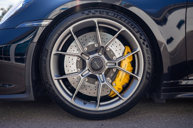 The exterior of the 2023 Porsche 911 GT3 is finished in a striking Jet Black Metallic, providing a sleek and sophisticated appearance that enhances the car's aerodynamic profile. The design is both timeless and aggressive, featuring the classic 911 silhouette with modern twists that signify its performance capabilities. The front fascia is characterized by large air intakes that not only contribute to the car’s aggressive stance but also play a crucial role in engine cooling and aerodynamics. The lightweight construction of the GT3 is enhanced by the use of carbon fiber, which is evident in various components such as the front and rear bumpers and the rear wing, further emphasizing its racing heritage.